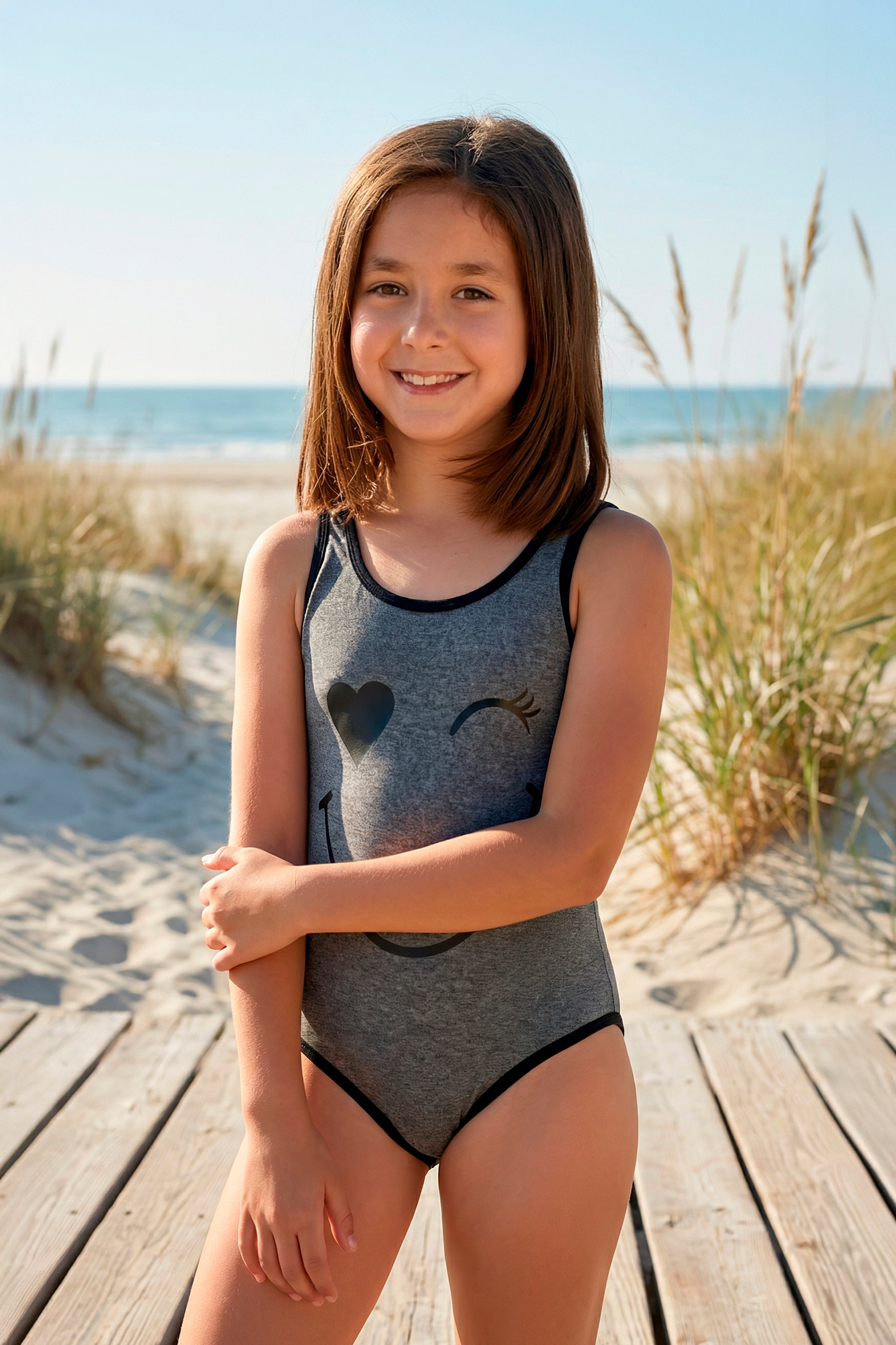 Malla entera en melange con estampa de cara sonriente, y vivos al tono. marca "Mare Moda".