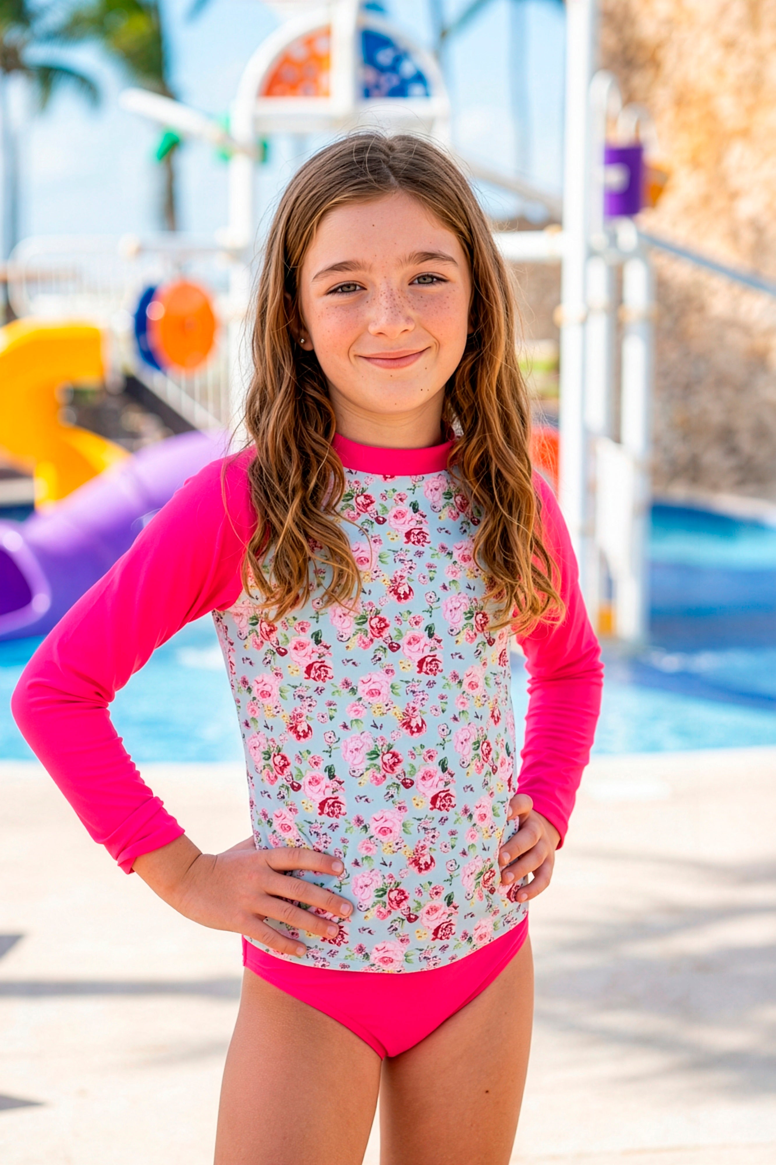Tankini nena de remera estampada con mangas largas lisas, con proteccion UV, y bombacha lisa. Marca "Mare Moda".